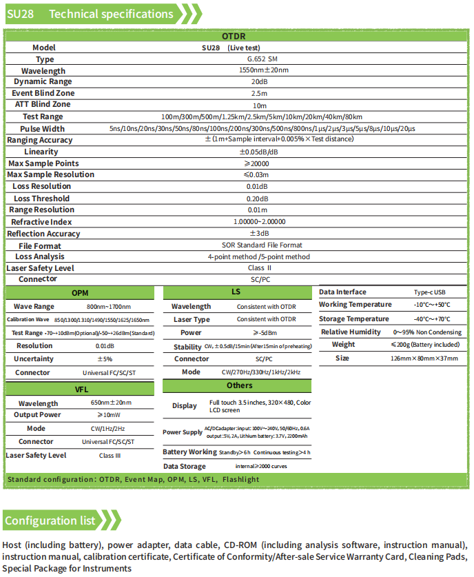 The SU28 optical time domain reflectometer is compact and easy to carry; it adopts a 3.5-inch high-definition touch screen, supports multi-touch and smooth operation. Internal integration of OTDR, event map, optical power meter, red light, flashlight and other functions in one, to meet various test needs in different occasions. Among them, the OTDR func -tion adopts 1550nm wavelength and built-in high-efficiency wavelength isolator. It can perform optical test on 1490nm and 1577nm links. It supports up to about +10dBm with optical test capability, and the maximum measurement range SU28 is used to measure the length, loss, connection quality and other parameters of the optical fiber. It can easily test the breakpoint, bend, and loss point of the optical fiber link. It is suitable for line maintenance and emergency repair testing by installation and maintenance personnel.