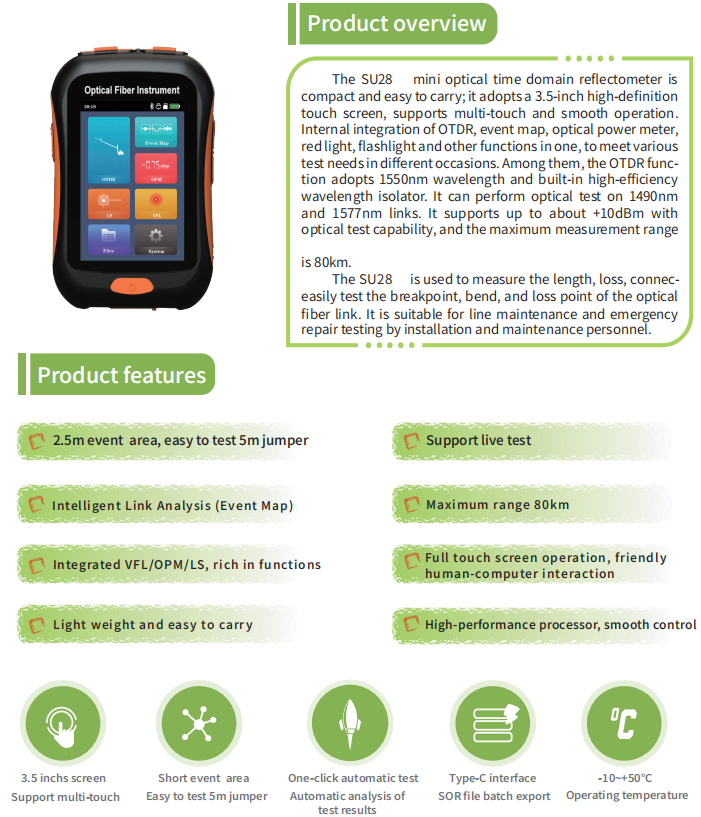 The SU28 optical time domain reflectometer is compact and easy to carry; it adopts a 3.5-inch high-definition touch screen, supports multi-touch and smooth operation. Internal integration of OTDR, event map, optical power meter, red light, flashlight and other functions in one, to meet various test needs in different occasions. Among them, the OTDR func -tion adopts 1550nm wavelength and built-in high-efficiency wavelength isolator. It can perform optical test on 1490nm and 1577nm links. It supports up to about +10dBm with optical test capability, and the maximum measurement range SU28 is used to measure the length, loss, connection quality and other parameters of the optical fiber. It can easily test the breakpoint, bend, and loss point of the optical fiber link. It is suitable for line maintenance and emergency repair testing by installation and maintenance personnel.